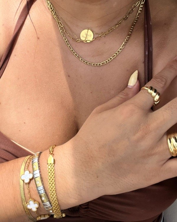 Nuestras joyas de acero quirúrgico dorado 316L están pensadas para acompañarte todos los días. Son resistentes al agua, hipoalergénicas y no se oxidan fácilmente.