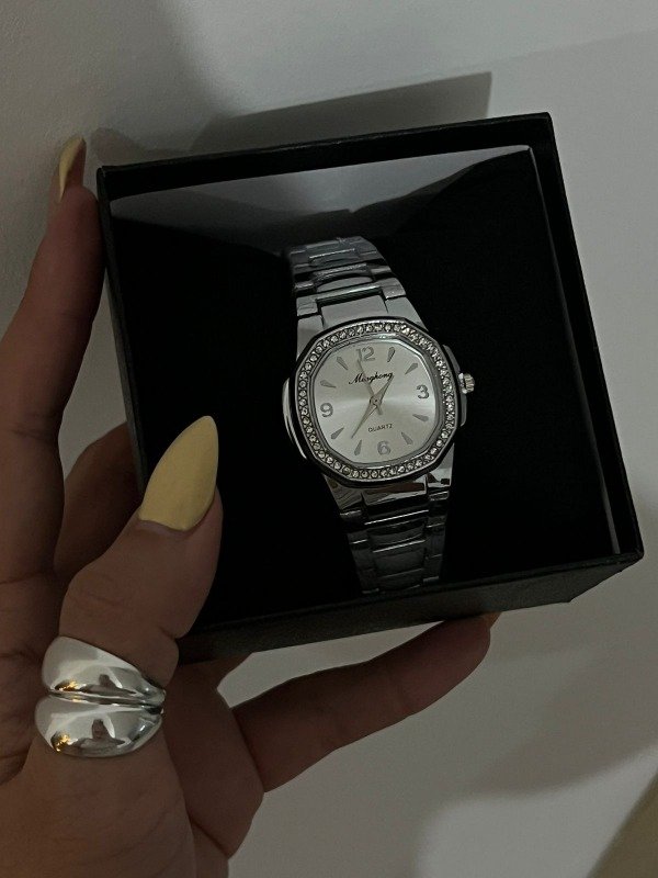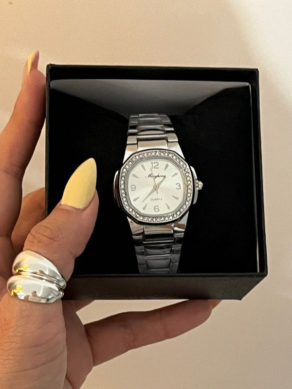 SET DE RELOJ PLATEADO CON BRILLOS+CAJA