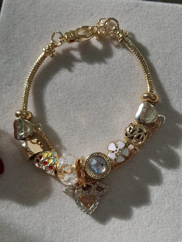 Esta pulsera está hecha en acero dorado, ideal para usar todos los días sin perder su brillo. Ya viene con dijes incluidos, pensados para sumar detalle y personalidad a tu estilo.