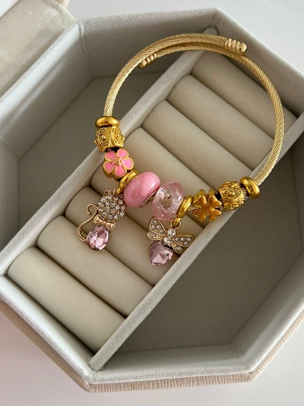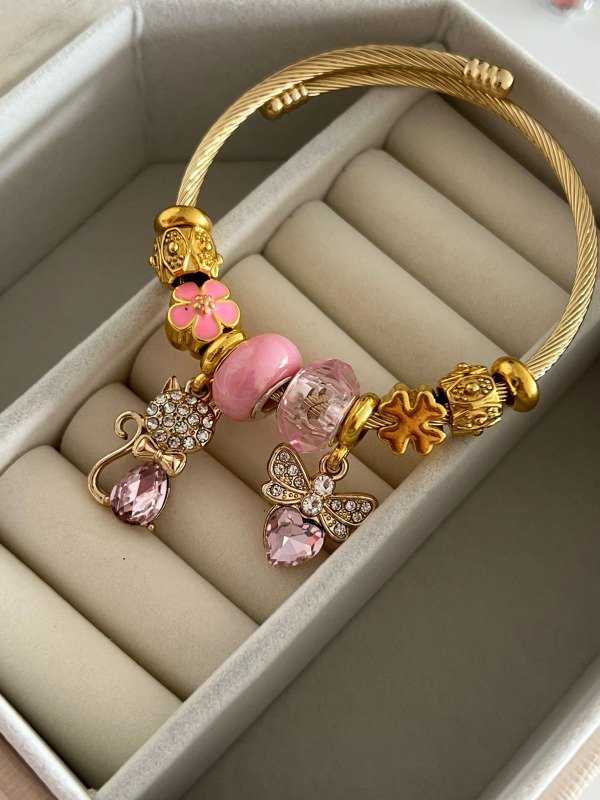 Esta pulsera está hecha en acero dorado, ideal para usar todos los días sin perder su brillo. Ya viene con dijes incluidos, pensados para sumar detalle y personalidad a tu estilo.