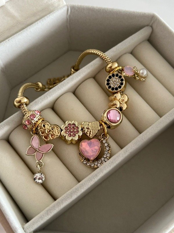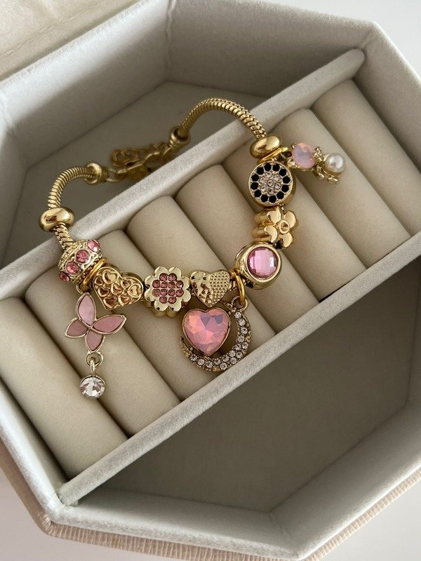 Esta pulsera está hecha en acero dorado, ideal para usar todos los días sin perder su brillo. Ya viene con dijes incluidos, pensados para sumar detalle y personalidad a tu estilo.