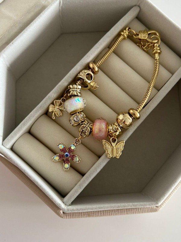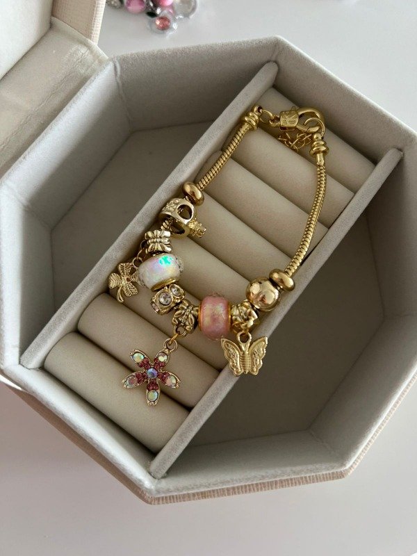 Esta pulsera está hecha en acero dorado, ideal para usar todos los días sin perder su brillo. Ya viene con dijes incluidos, pensados para sumar detalle y personalidad a tu estilo.