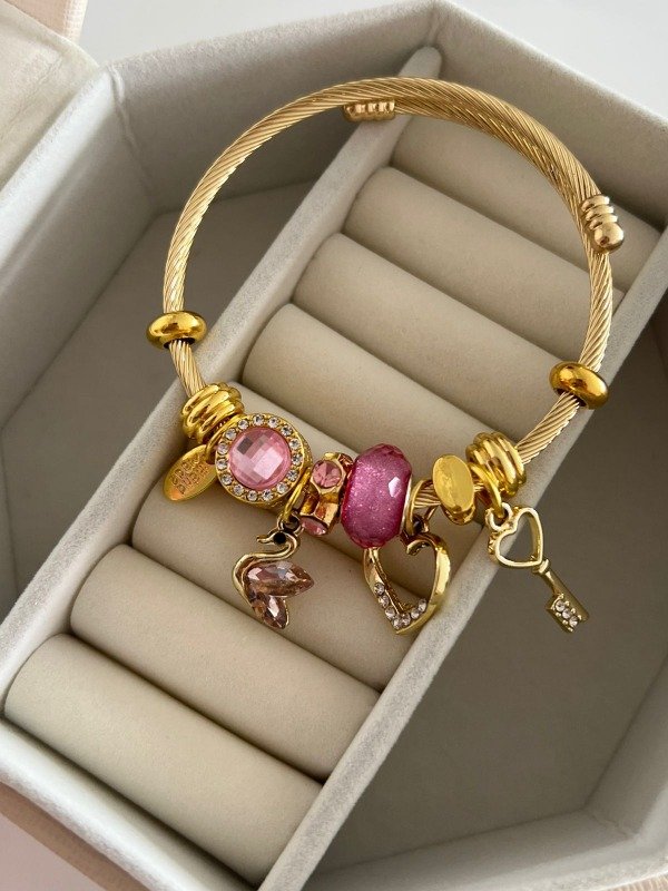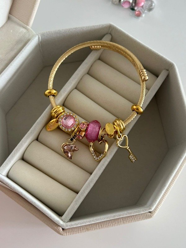 Esta pulsera está hecha en acero dorado, ideal para usar todos los días sin perder su brillo. Ya viene con dijes incluidos, pensados para sumar detalle y personalidad a tu estilo.