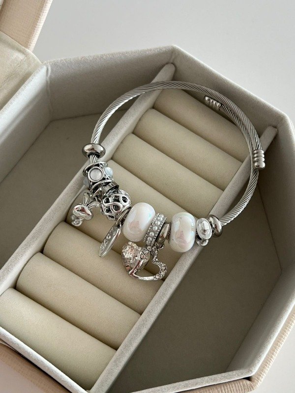 Esta pulsera está hecha en acero quirúrgico, ideal para usar todos los días sin perder su brillo. Ya viene con dijes incluidos, pensados para sumar detalle y personalidad a tu estilo.
