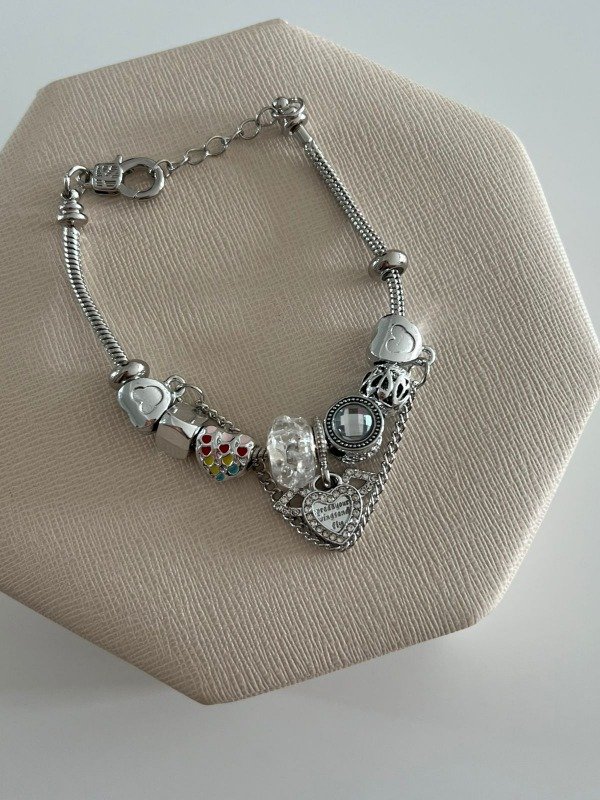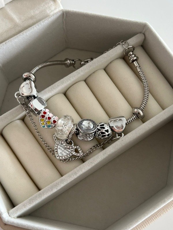 Esta pulsera está hecha en acero quirúrgico, ideal para usar todos los días sin perder su brillo. Ya viene con dijes incluidos, pensados para sumar detalle y personalidad a tu estilo.