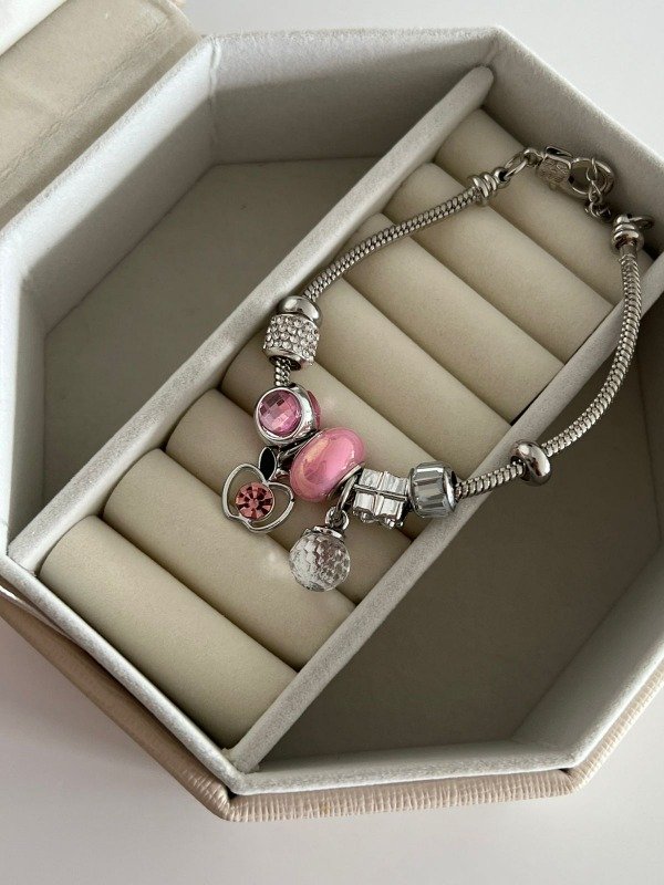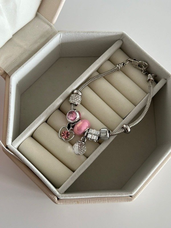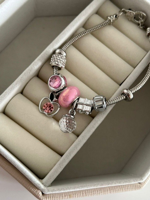 PULSERA PANDORA CON DIJES DE MANZANA ROSA+ESFERA B