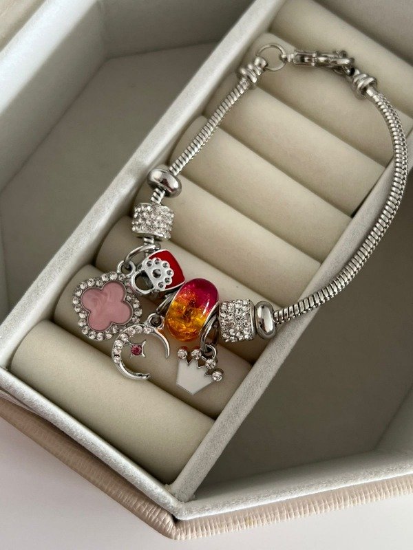 Esta pulsera está hecha en acero quirúrgico, ideal para usar todos los días sin perder su brillo. Ya viene con dijes incluidos, pensados para sumar detalle y personalidad a tu estilo.