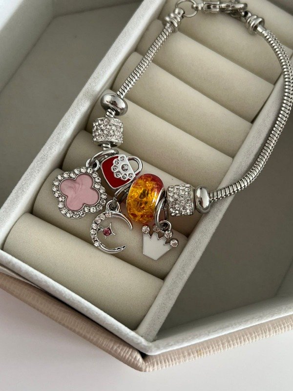 PULSERA PANDORA CON DIJES NARANJA+CORONA P
